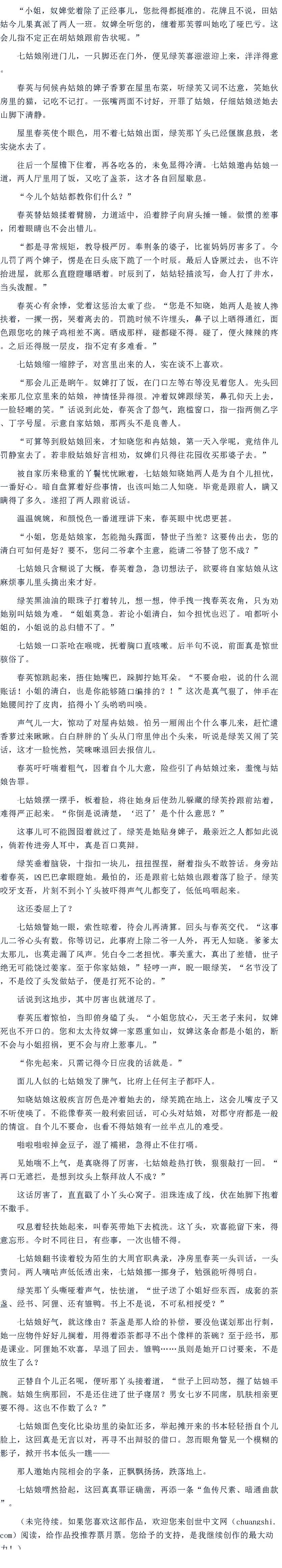 “小姐,奴婢觉着除了正经事儿,您批得都挺准的。花牌且不说,田姑姑今儿果真派了两人一班。奴婢全听您的,缠着那芙蓉叫她吃了哑巴亏。这会儿指不定正在胡姑娘跟前告状呢。”