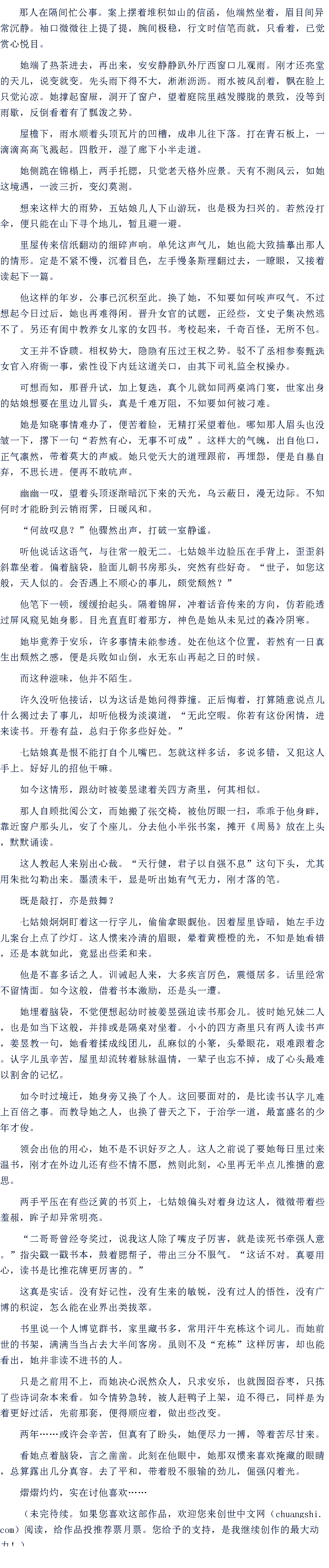 那人在隔间忙公事。案上摆着堆积如山的信函,他端然坐着,眉目间异常沉静。袖口微微往上提了提,腕间极稳,行文时信笔而就,只看着,已觉赏心悦目。
