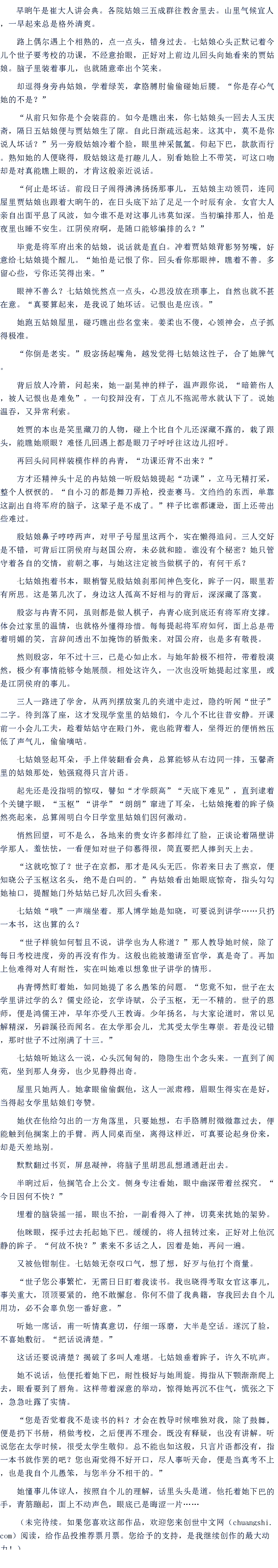 早晌午是崔大人讲会典。各院姑娘三五成群往教舍里去。山里气候宜人,一早起来总是格外清爽。